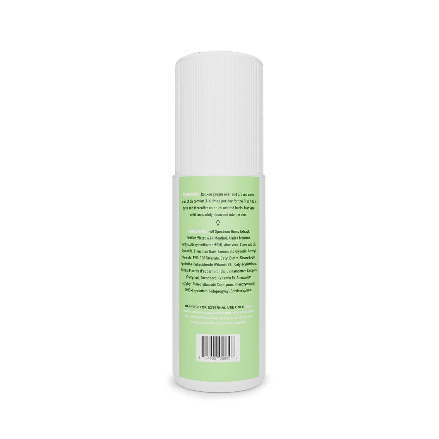 Ingredients: Phytocannabinoid Rich Hemp Extract (THC-Free), Distilled Water, 6.6% Menthol, Arnica Montana, Methysulfonymethane,(MSM), Aloe Vera, Clove Bud Oil, Citronella, Cinnamon Bark, Lemon Oil, Glycerin, Glycryl Stearate, PEG-100 Stearate, Cetyl Esters,Steareth-20, Pyridoxine Hydrochloride (Vitamin B6), Cetyl Myristoleate, Mentha Piperita (Peppermint) Oil, Cinnamomum Campora (Camphor), Tocopherol (Vitamin E), Ammonium Acryloyl-Dimethytaurate Copolymer, Phenoxyethanol,DMDM Hydantoin, lodopropynyl Butylcarbamate.
